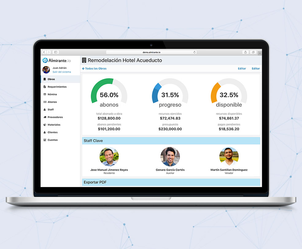 Almirante is an enterprise resource planning system for architects and builders. Automate payroll and purchase orders; keep track of staff, clients and vendors; and collaborate with your team from your computer or smartphone.